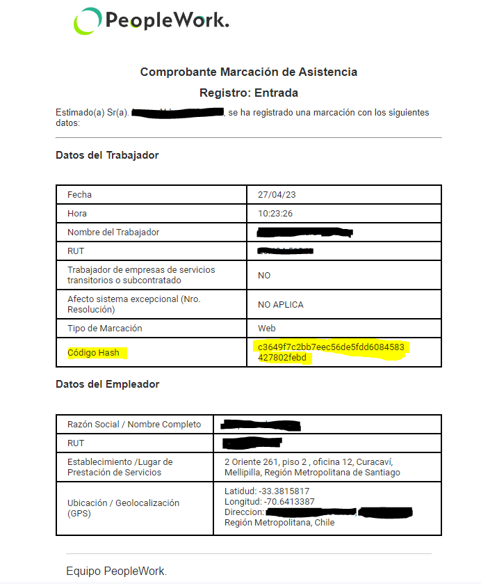 Cuando se genera el comprobante de asistencia, llega al correo del trabajador la información respectiva, con el código HASH correspondiente.