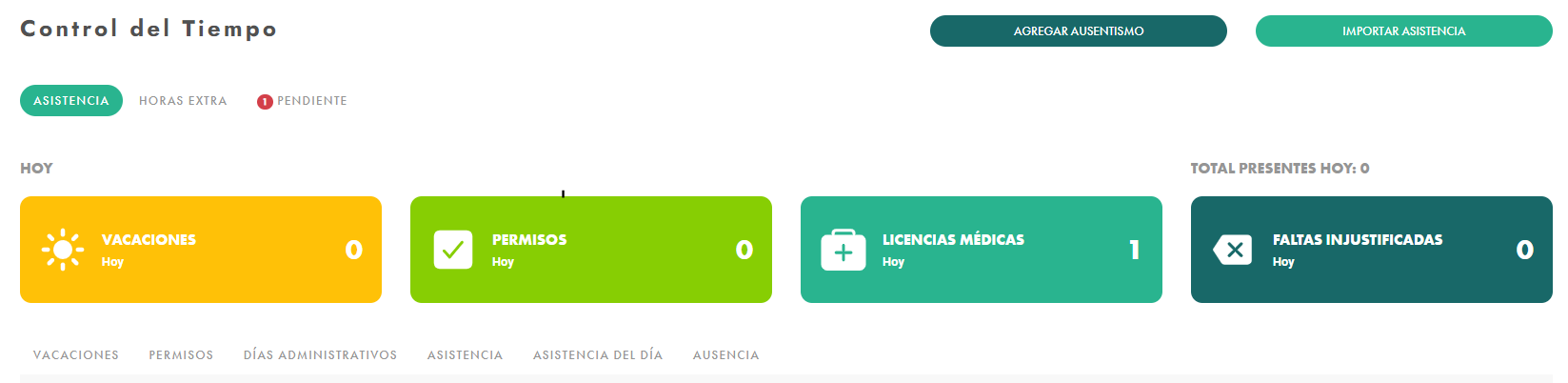 En la plataforma de PeopleWork, acceder al panel del lado izquierdo en el renglón CONTROL DEL TIEMPO - DASHBOARD