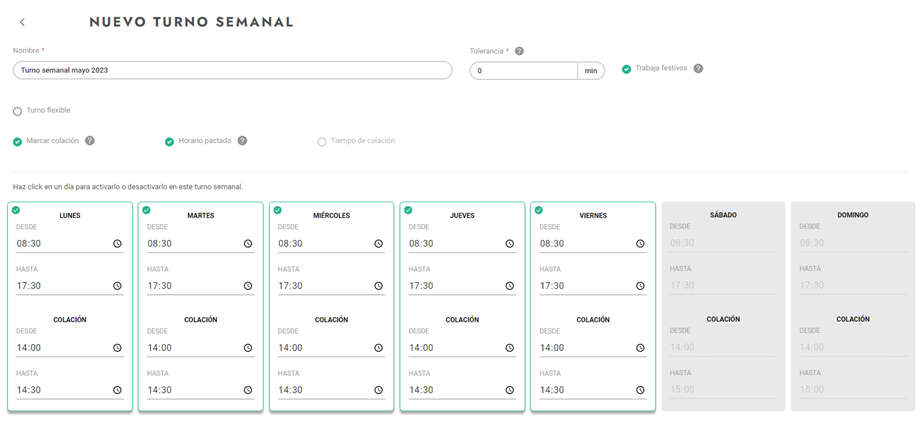 Horario pactado: se refiere a que existe un horario establecido para la colación, por ejemplo, de 14:00 – 14:30 horas, en la siguiente figura se visualiza los días para la asignación respectiva de los turnos.