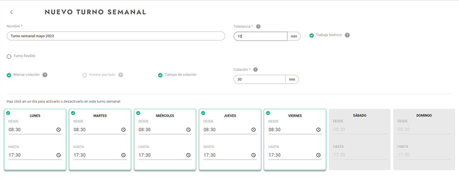 Se muestra la siguiente pantalla en donde se configura el turno respectivo