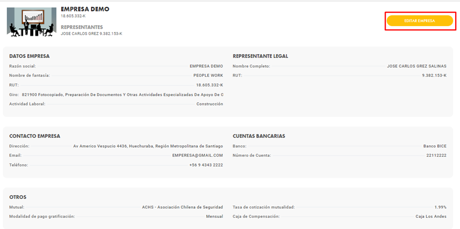 La ficha contiene los datos de la empresa, los cuales se utilizan tanto para asociarse con la ficha de los trabajadores como también para diferentes procesos en PeopleWork.